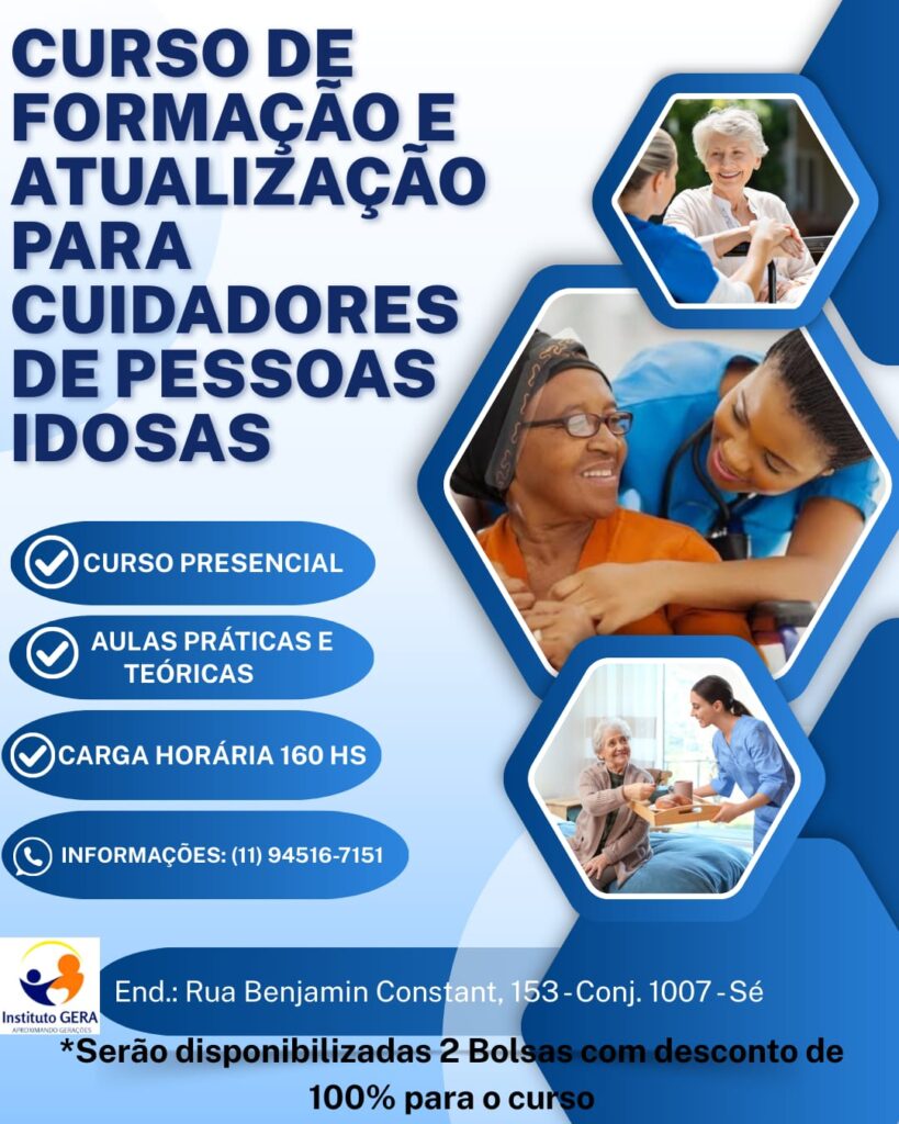 Promovido pelo Instituto GERA, o curso possibilita aos participantes qualificarem-se na prática dos cuidados,considerando aspectos físicos, emocionais, políticos e sociais referente ao processo do envelhecimento e a velhice.